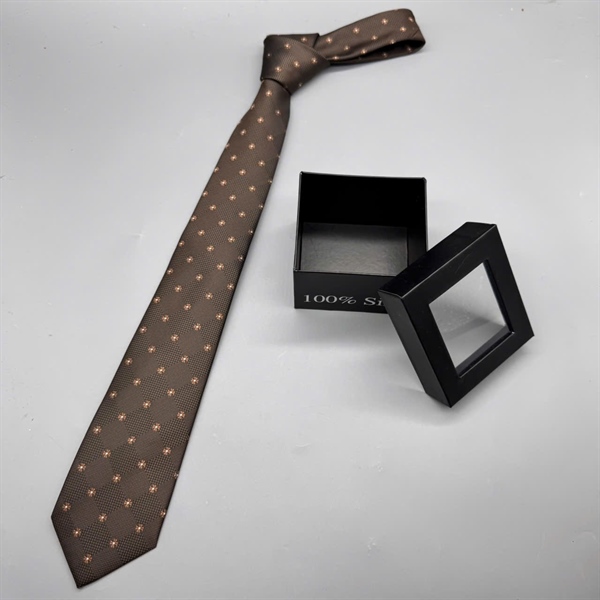 Cà vạt nam mẫu nâu chấm hoa vàng tự thắt 7cm cao cấp kèm hộp đựng