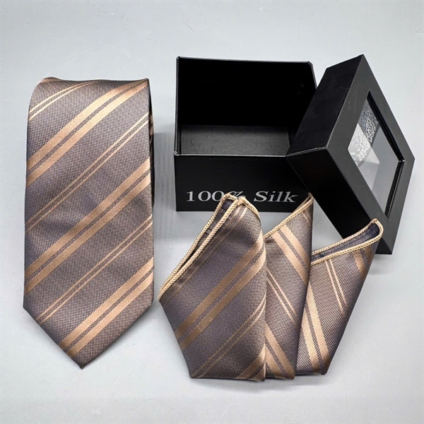 Cà vạt nam mẫu nâu kẻ vàng tự thắt bản 7cm kèm khăn túi và hộp - tặng kèm kẹp cà vạt CV25-T5