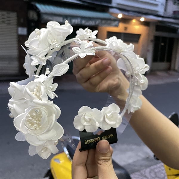 Băng đô cài tóc cô dâu hoa hồng trắng nụ kèm bông tai