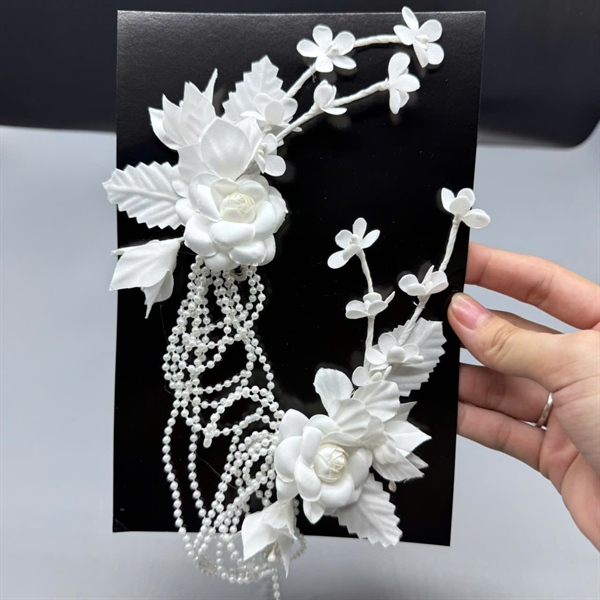🌸 Cài Tóc Cô Dâu Hoa Hồng Trắng – Dây Hạt Chùm Tua Rua Thanh Tao & Tinh Khôi