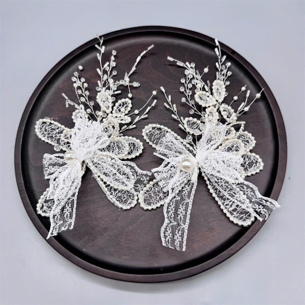 Mẫu cài tóc cô dâu nơ ren đính hạt trai pha lê là lựa chọn hoàn hảo cho cô dâu yêu thích phong cách trẻ trung, nhẹ nhàng và tinh tế. Thiết kế nơ ren mềm mại, kết hợp cùng hạt trai và pha lê lấp lánh, tạo nên điểm nhấn ngọt ngào giúp cô dâu nổi bật mà vẫn giữ nét dịu dàng, thanh thoát.