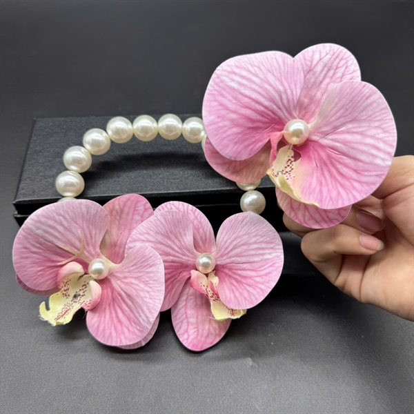Nếu bạn đang tìm kiếm một set phụ kiện cưới mang lại cảm giác tươi tắn, nhẹ nhàng nhưng vẫn sang trọng, thì bộ cài tóc hoa lan màu hồng từ chất liệu cao su mềm mại kết hợp cùng vòng hạt trai cầm tay đính hoa lan hồ điệp sẽ là sự lựa chọn lý tưởng cho bạn.