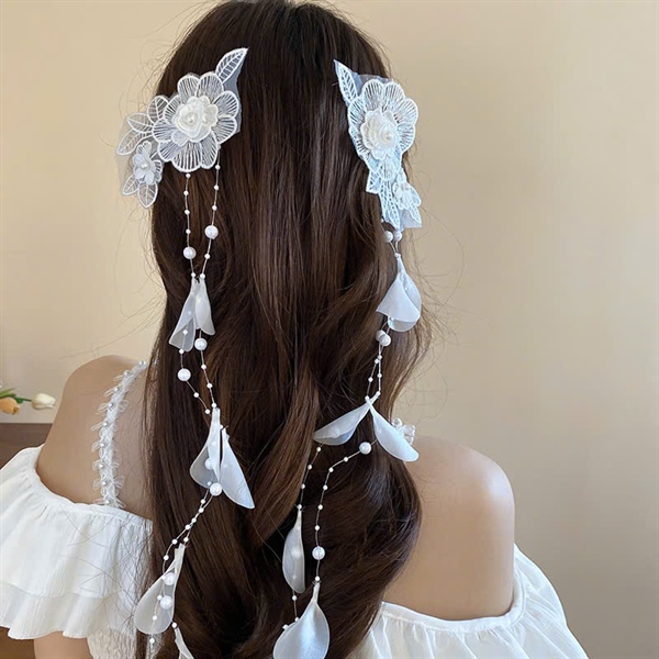 Biến mái tóc cô dâu thành kiệt tác hoàn mỹ với cài tóc ren hoa mềm mại, đầy tinh tế! Thiết kế gồm hoa ren thủ công kết hợp với chi tiết dây thả nhẹ nhàng và điểm xuyết hạt ngọc tạo nên sự sang trọng và cuốn hút.