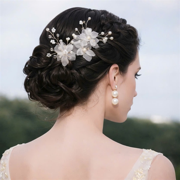 Mẫu trâm cài tóc hoa voan trắng đính hạt trai mang lại nét thanh lịch và mềm mại, rất hợp cho các kiểu tóc búi cô dâu hiện đại.