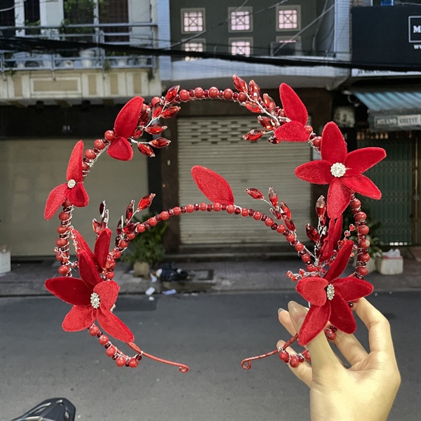 Mấn cô dâu cách tân màu đỏ hoa nhung đính đá đỏ mẫu mới