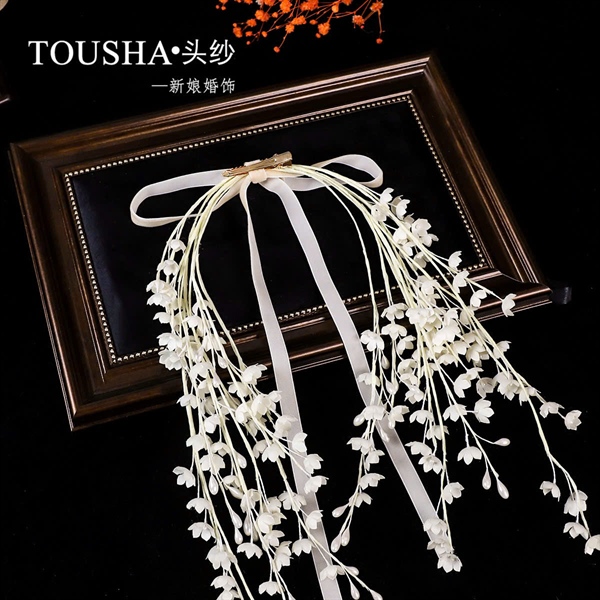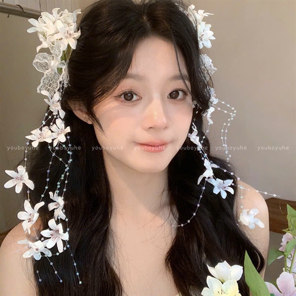 Cài tóc cô dâu dây linh lan đính nơ tua rua màu trắng