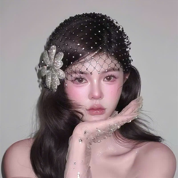 Cài tóc cô dâu lưới đen đính đá kèm hoa cài đá lấp lánh