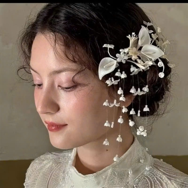 Cài tóc cô dâu hoa Callalili mini trắng mix hoa linh lan tua rua nhỏ xinh