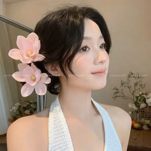 Cài tóc hoa mộc lan màu hồng có sẵn kẹp cài ( 1 bông )