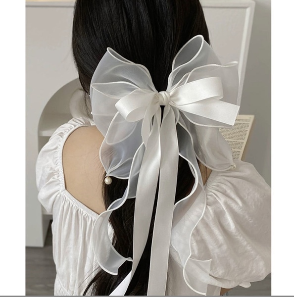 Nơ cài tóc voan đuôi dài màu trắng mẫu kẹp bấm (dài 35cm rộng 21cm)