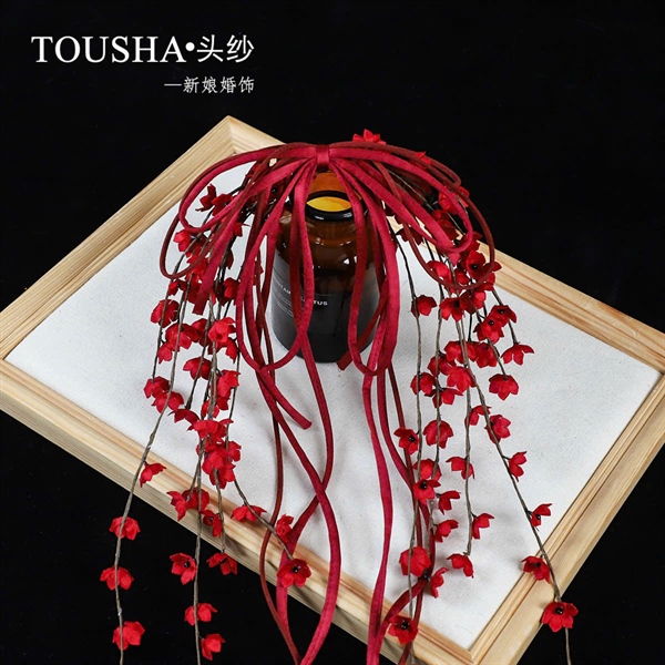 Cài tóc cô dâu dây linh lan đính nơ tua rua màu đỏ trầm