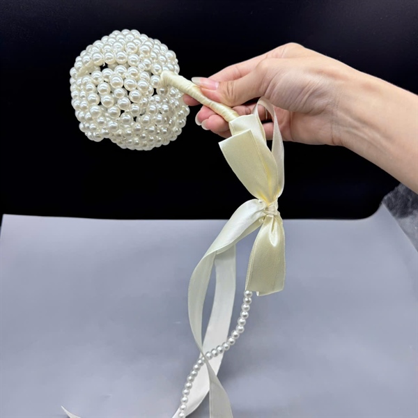 Hoa cầm tay cô dâu hạt trai trắng ngà cổ điển đính nơ ruy băng