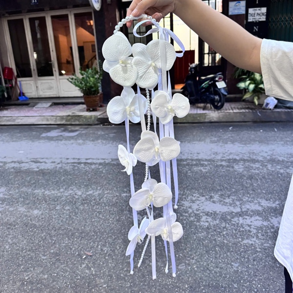 vòng hoa sách tay cô dâu hoa lan trắng dây ruy băng tua rua