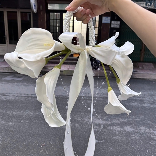 Hoa cầm tay cô dâu Callalily trắng sách tay vòng hạt trai dễ thương