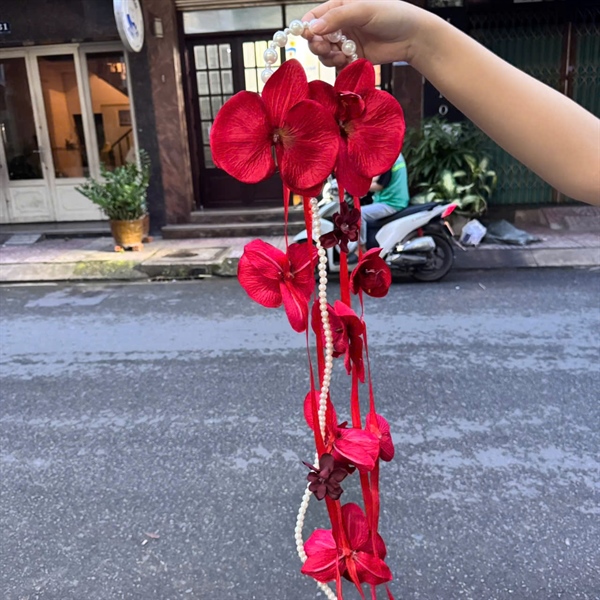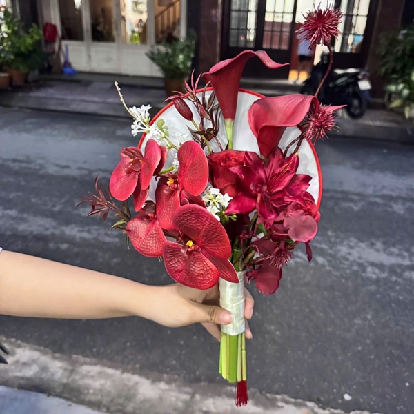 Hoa cầm tay cô dâu mặc áo dài Lan Hồ Điệp màu đỏ vải