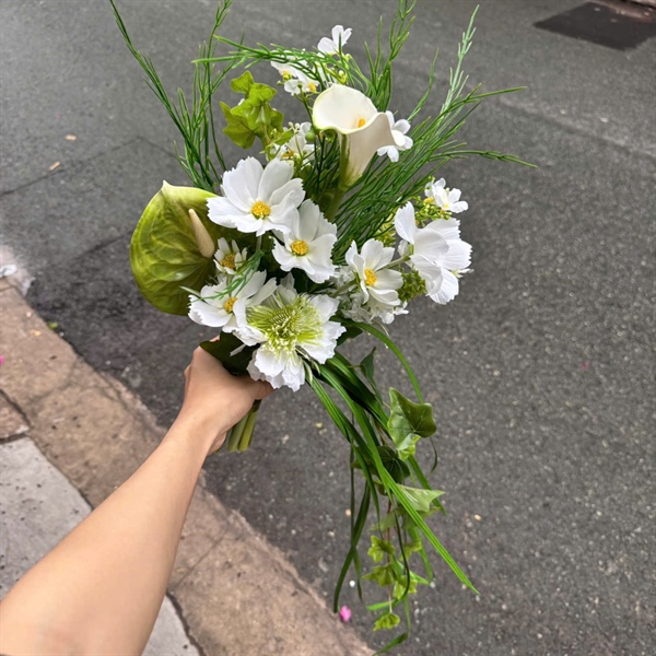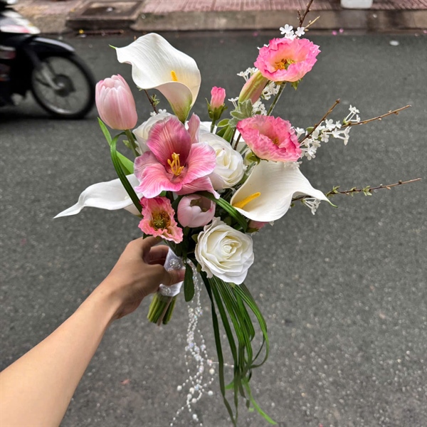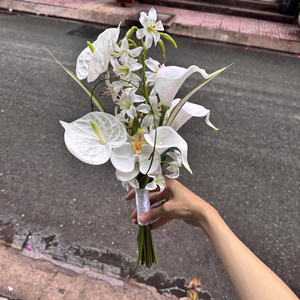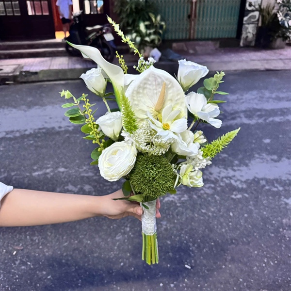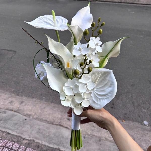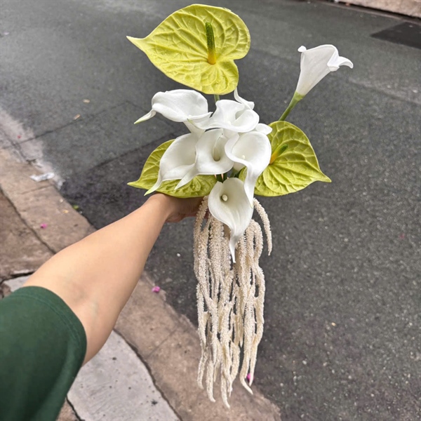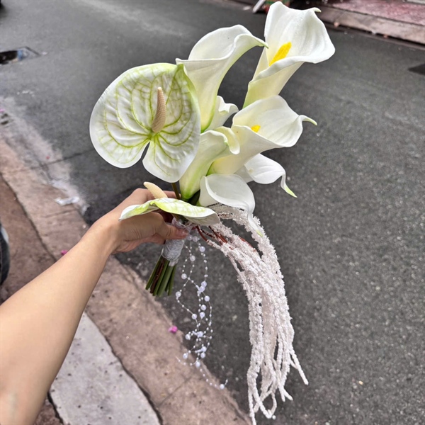 Hoa cầm tay cô dâu hồng môn trắng mix Callalily và cỏ trắng