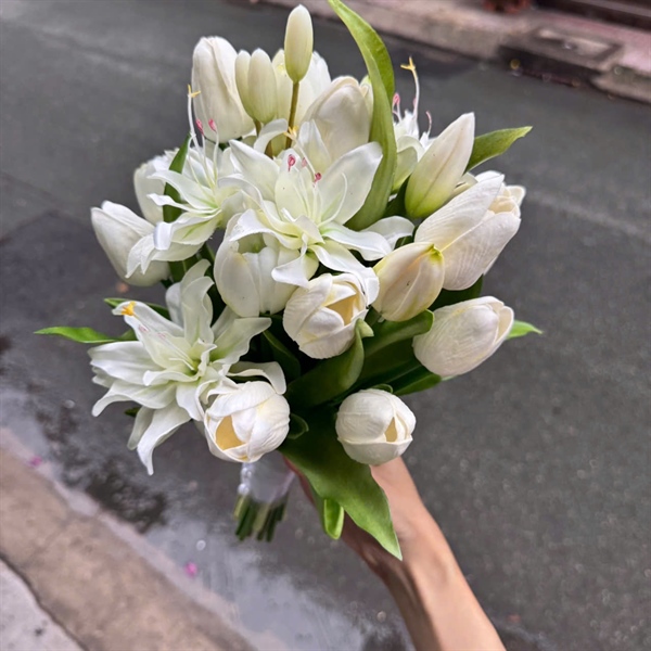 Hoa cầm tay cô dâu tulip màu trắng mix hoa trắng cánh kép
