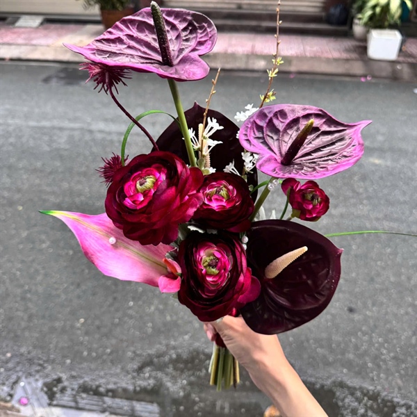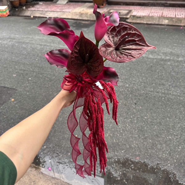 Hoa cầm tay cô dâu hồng môn đỏ đô mix mao lương tone đỏ đô sang trọng