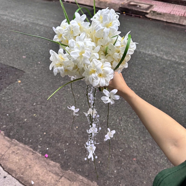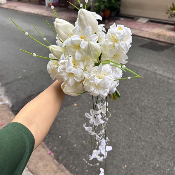 Hoa cầm tay cô dâu dạ lan hương màu trắng dây hoa rua rua