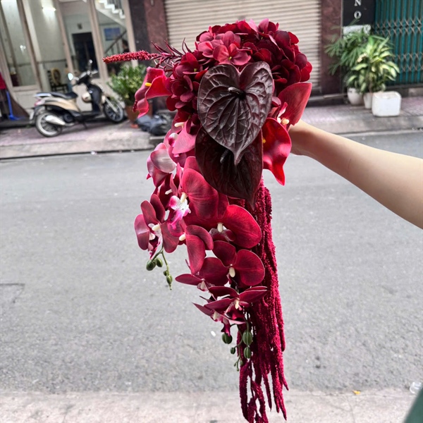 Hoa cầm tay cô dâu lan hồ điệp mix cẩm tú cầu và hồng môn tone đỏ đô
