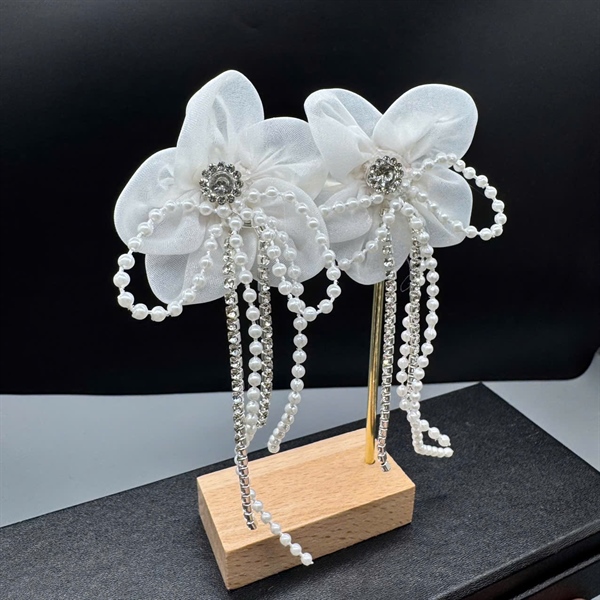 Bông tai hoa voan trắng đính nơ hạt trai điểm đá dễ thương