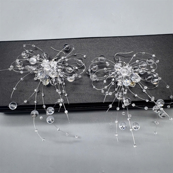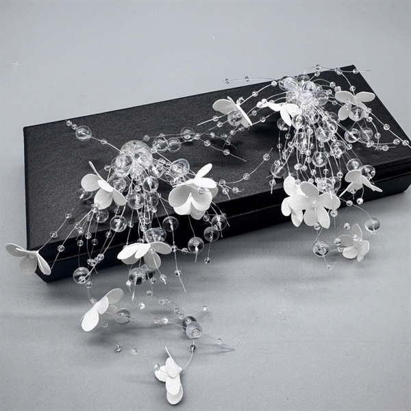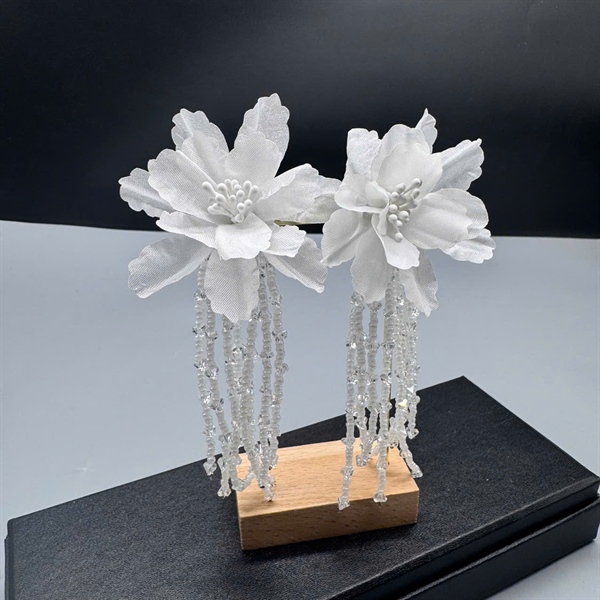 Bông tai cô dâu hoa trắng đính dây hạt pha lê tua rua sang trọng