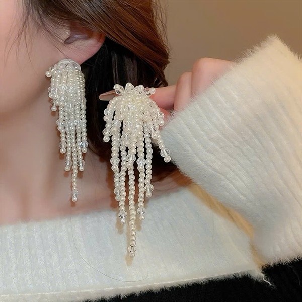 Bông tai cô dâu chùm hạt trai mix pha lê tua rua sang trọng