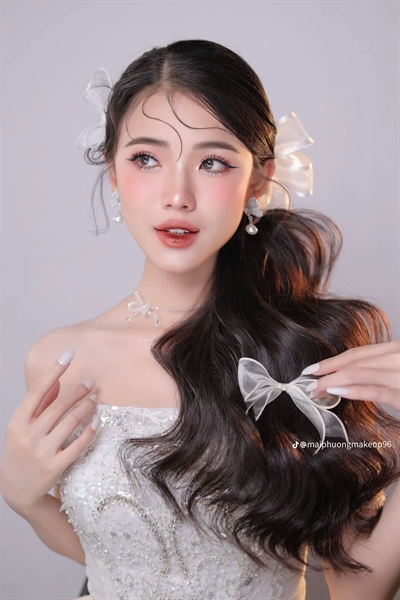 Cài tóc cô dâu dây linh lan đính nơ tua rua màu trắng